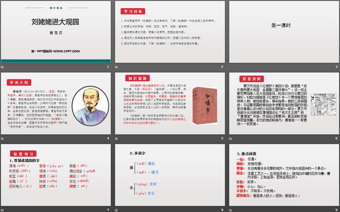 1.识记曹雪芹和《红楼梦》的文学常识;了解《红楼梦》中的主要人物和情节。