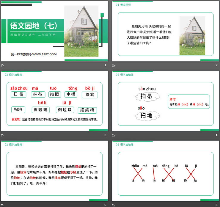 星期天,小明决定和妈妈一起进行大扫除,让我们看一看他们在大扫除的时候做了些什么?用到了哪些清扫工具?