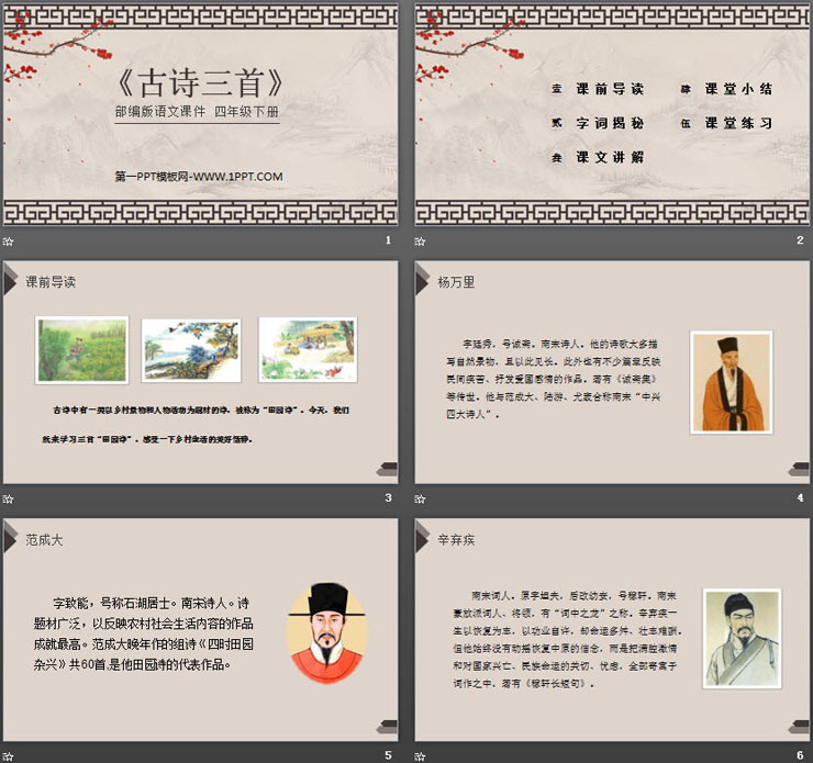 关键词:古诗三首PPT课件免费下载,宿新市徐公店PPT下载,四时田园杂兴PPT下载,清平乐村居PPT下载,.PPT格式;