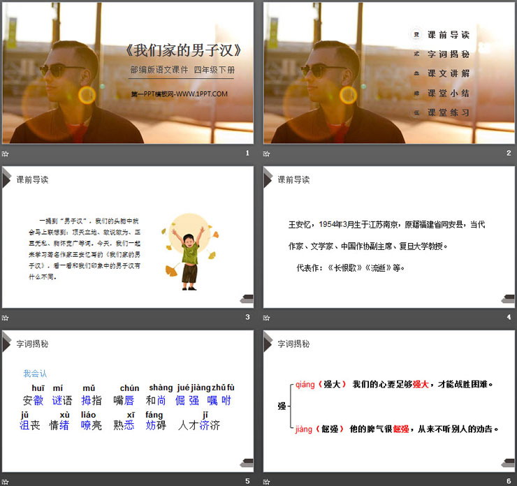 一提到“男子汉”,我们的头脑中就会马上联想到:顶天立地、敢说敢为、正直无私、胸怀宽广等词。今天,我们一起来学习著名作家王安忆写的《我们家的男子汉》,看一看和我们印象中的男子汉有什么不同。