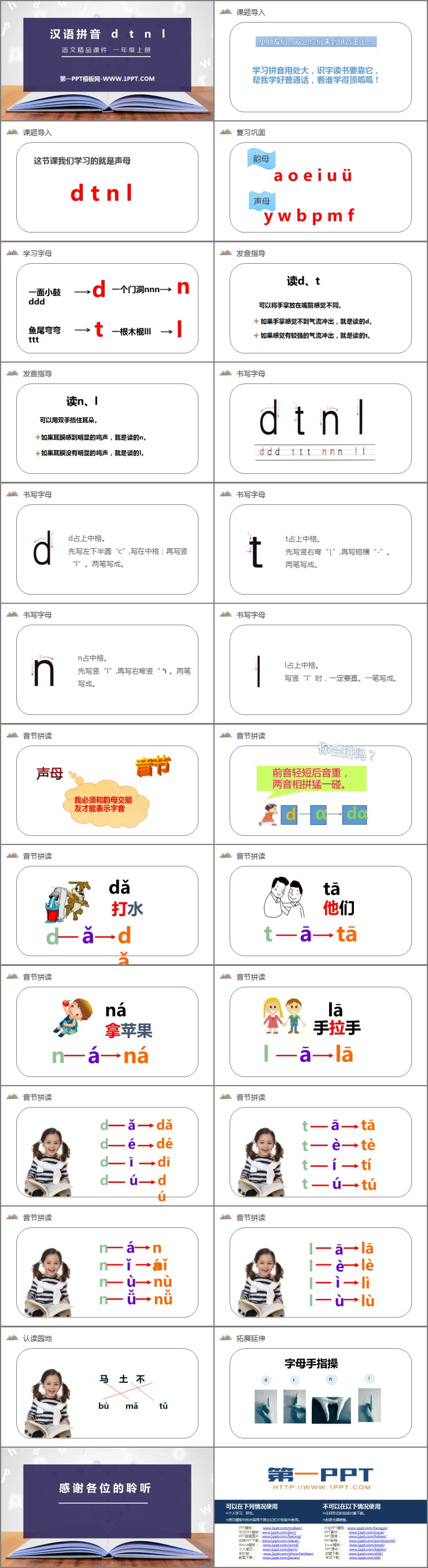 《dtnl》PPT课件包含课题导入、复习巩固、学习字母、发音指导、书写字母、音节拼读、拓展延伸等内容。