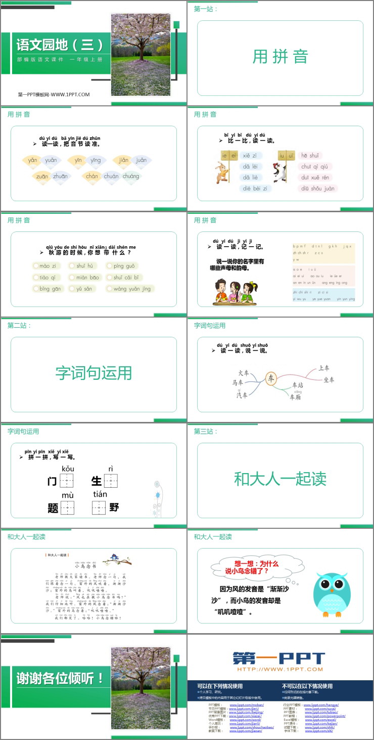 《语文园地三》PPT课件包含用拼音、字词句运用、和大人一起读等内容。
