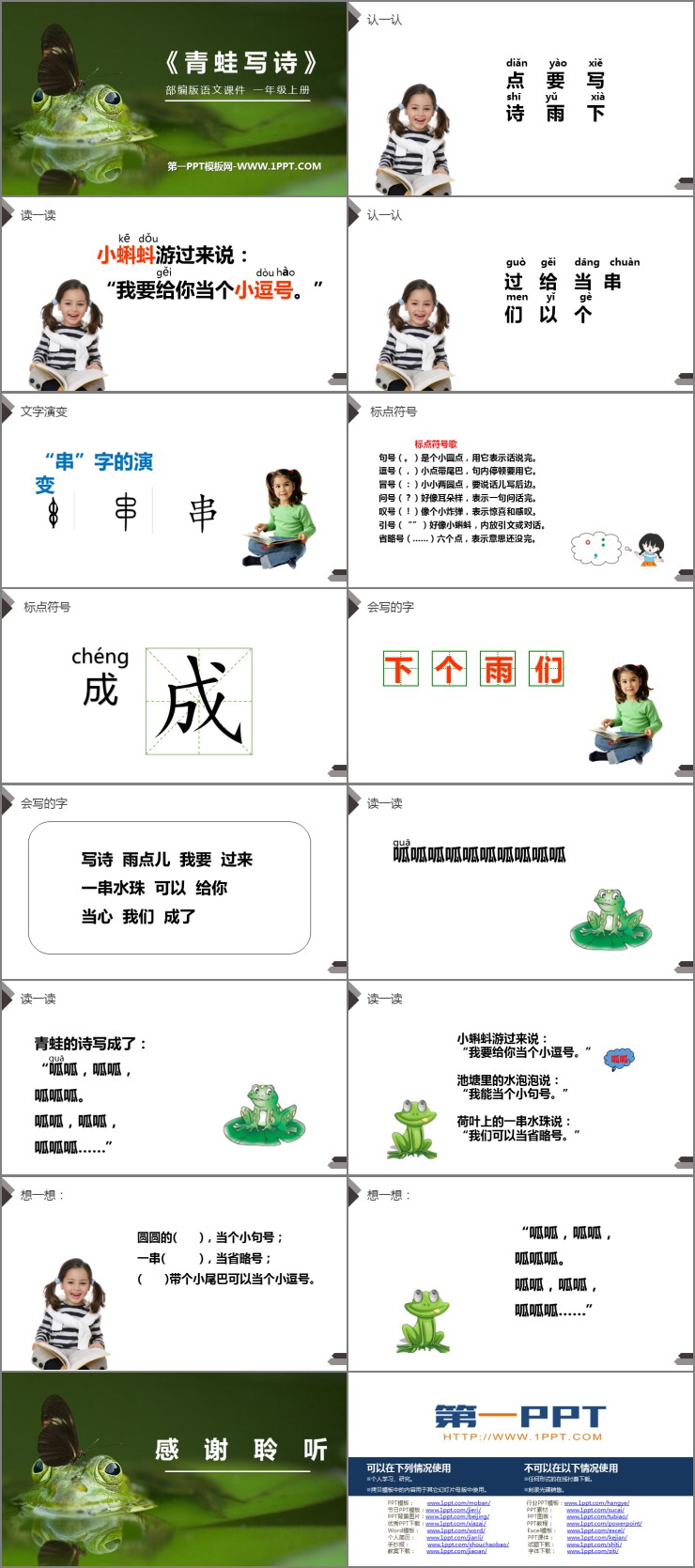《青蛙写诗》PPT课件包含认一认、读一读、文字演变、标点符号、会写的字等内容。