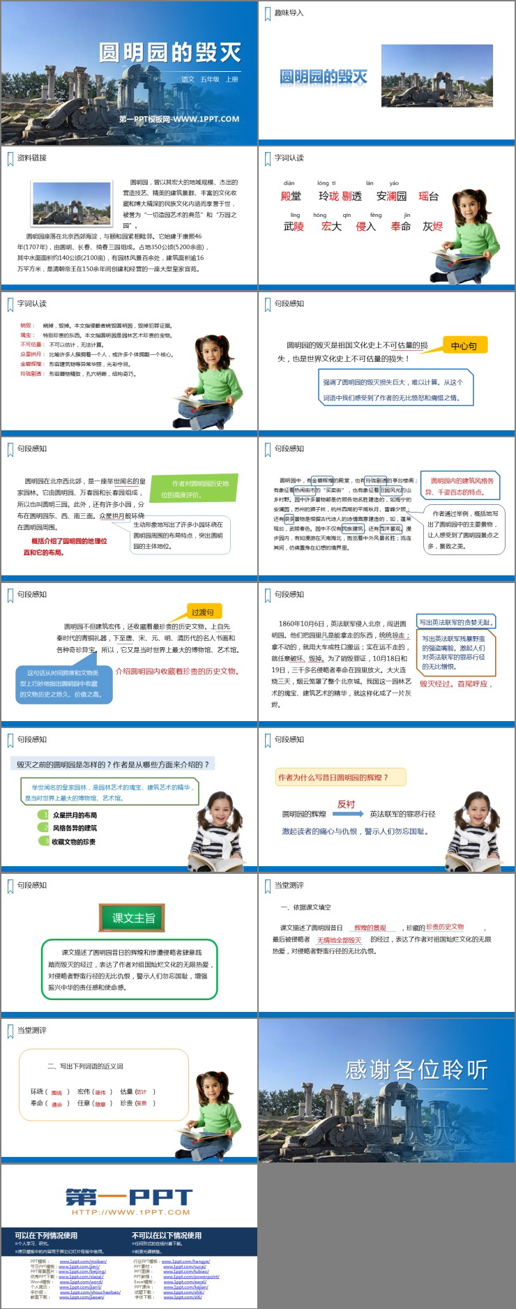 《圆明园的毁灭》PPT精品课件包含趣味导入、字词认读、资料链接、句段感知、当堂测评等内容。