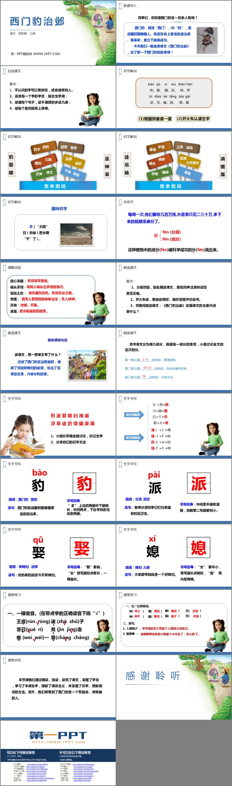 《西门豹治邺》PPT精品课件包含新课导入、自读课文、识字解词、理解词语、朗读课文、生字书写、课堂练习、课堂总结等内容。