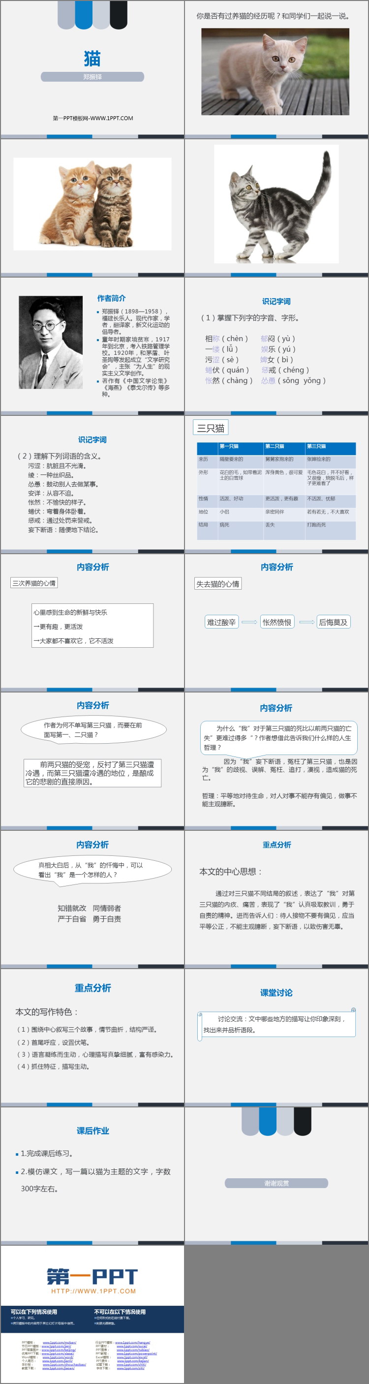 《猫》PPT课件包含作者简介、识记字词、内容分析、重点分析、课堂讨论、课后作业等内容。