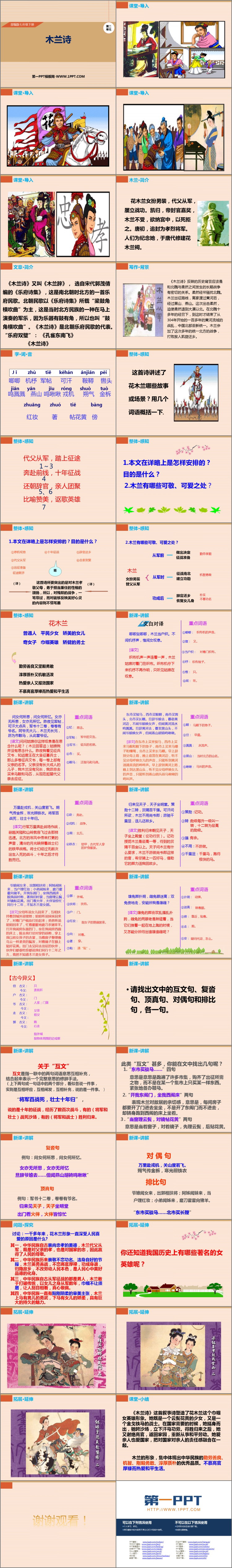 课件包含课堂·导入、木兰·简介、文章·简介、写作·背景、字·词·音、整体·感知、新课·讲解、问题·探究、课堂·小结等内容。