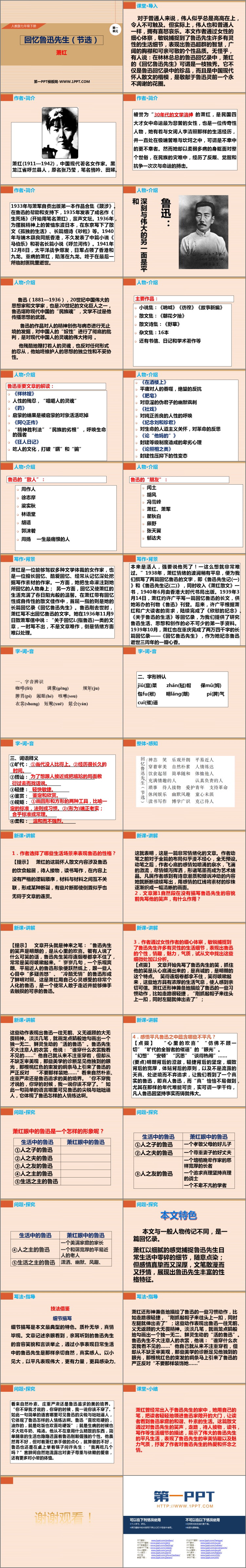 《回忆鲁迅先生》PPT课件包含课堂导入、作者简介、人物介绍、写作背景、字词音、新课讲解、问题探究、写法指导、课堂小结等内容。
