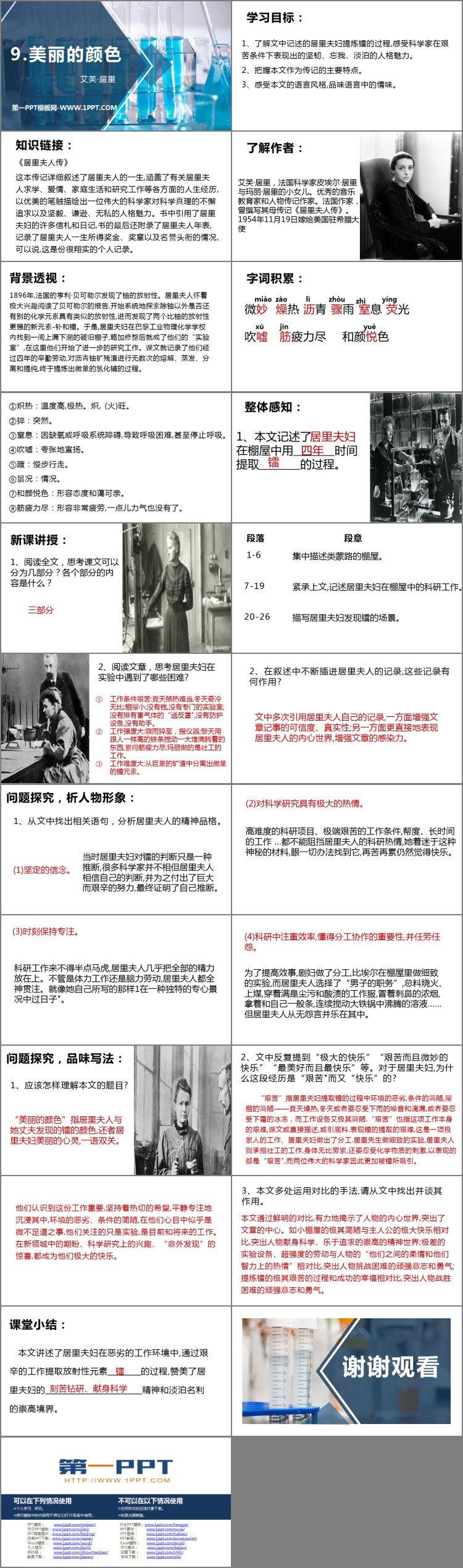 学习居里夫妇在科学研究上刻苦钻研、坚韧执着、以苦为乐的精神;感受科学家朴实恬淡的人格魅力。