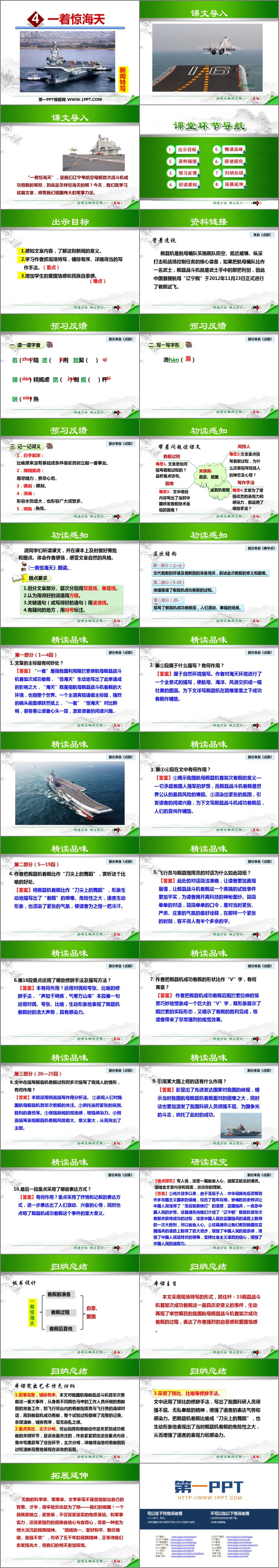 《一着惊海天》PPT课件包含课文导入、资料链接、预习反馈、初读感知、精读品味、研读探究、归纳总结等内容。