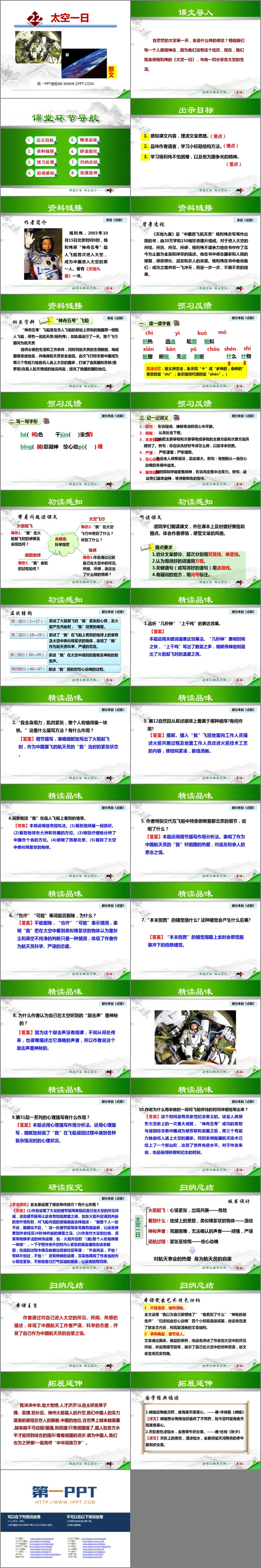 《太空一日》PPT课件包含课文导入、资料链接、预习反馈、初读感知、精读品味、研读探究、归纳总结等内容。
