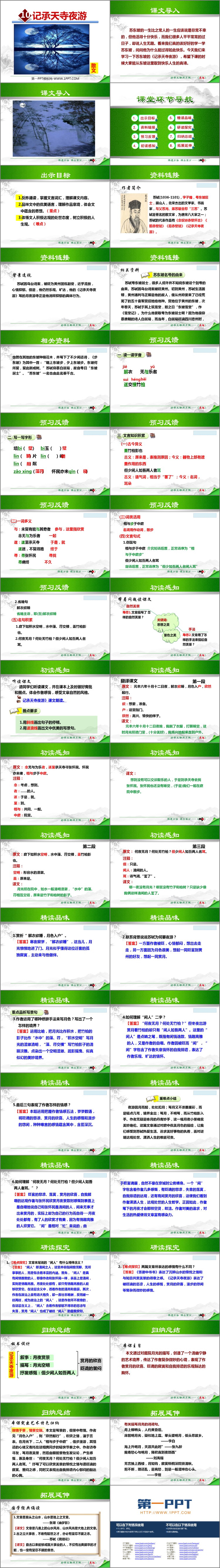 《记承天寺夜游》PPT课件包含课文导入、资料链接、预习反馈、初读感知、精读品味、归纳总结等内容。
