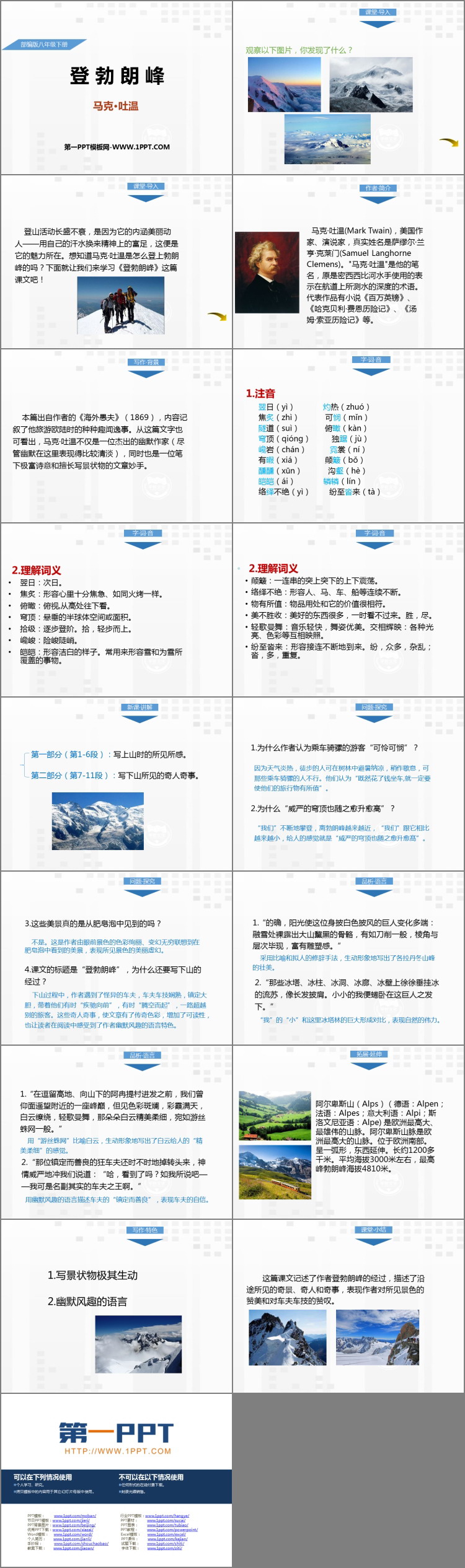 《登勃朗峰》PPT课件包含课堂导入、作者简介、写作背景、字词音、新课讲解、问题探究、品析语言、写作特色、课堂小结等内容。