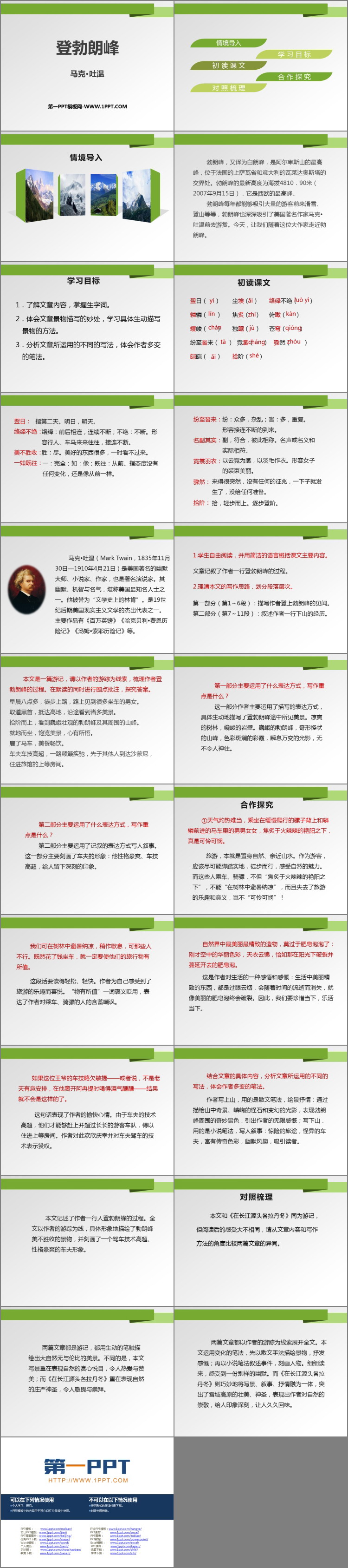 《登勃朗峰》PPT课件包含情境导入、学习目标、初读课文、合作探究、对照梳理等内容。