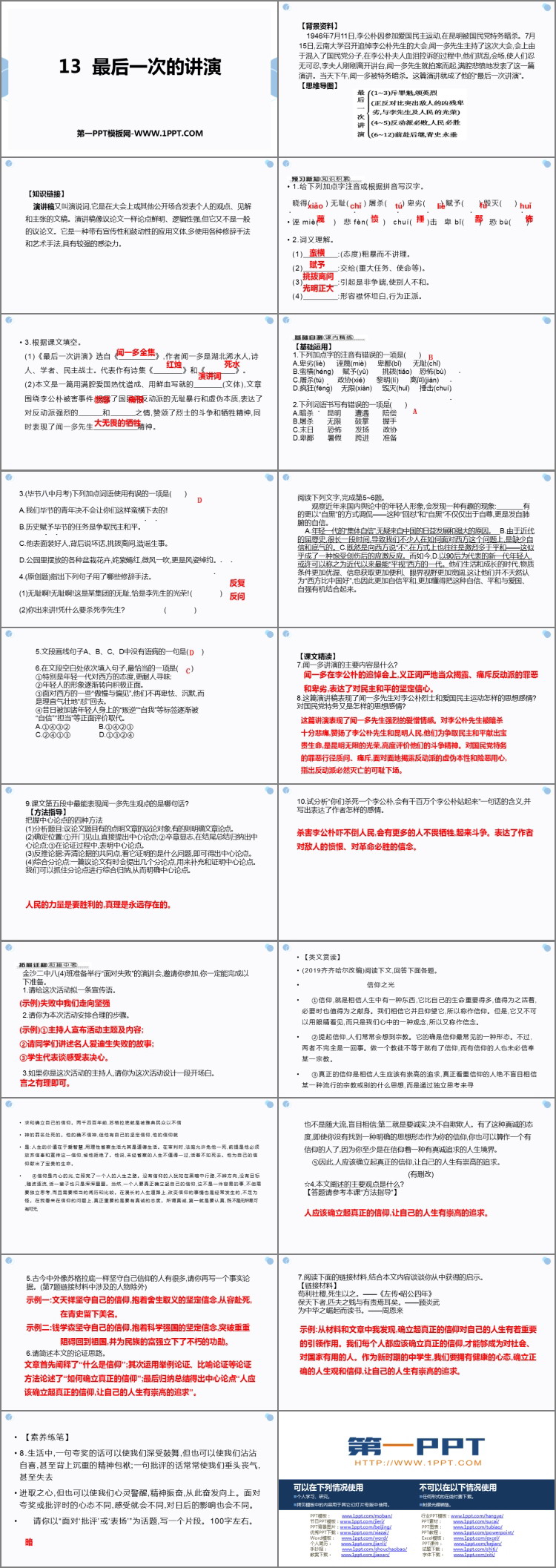 《最后一次讲演》PPT课件包含背景资料、知识链接、基础运用、课文精读等内容。