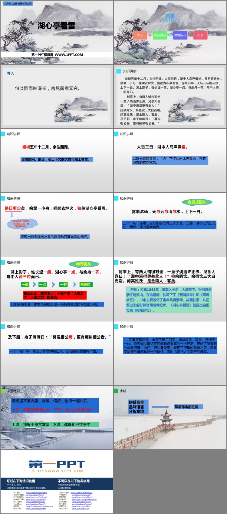 《湖心亭看雪》PPT课件包含导入、知识讲解、课堂练习、小结等内容。