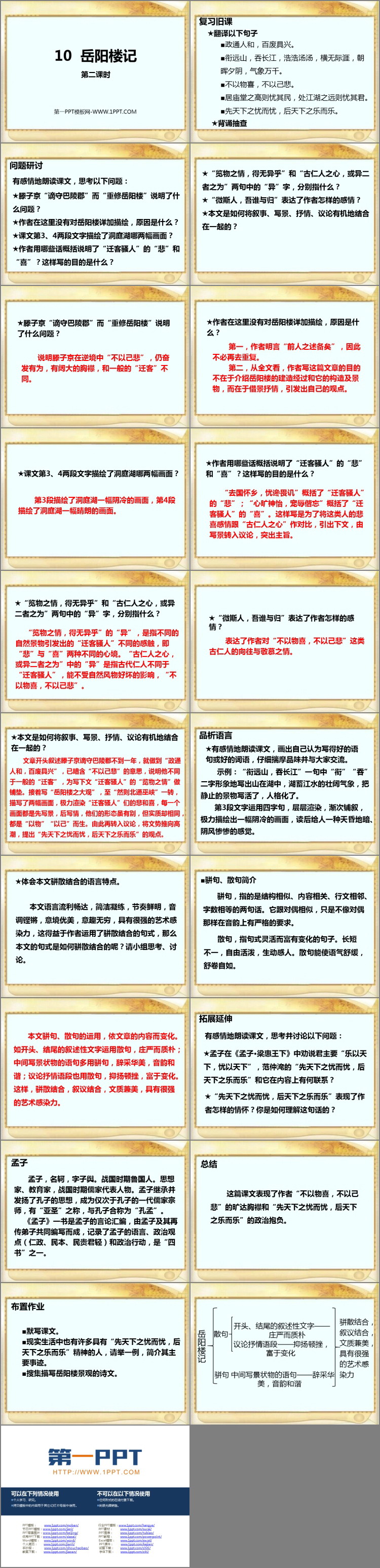 《岳阳楼记》PPT课件包含复习旧课、问题研讨、品析语言、拓展延伸、总结、布置作业等内容。