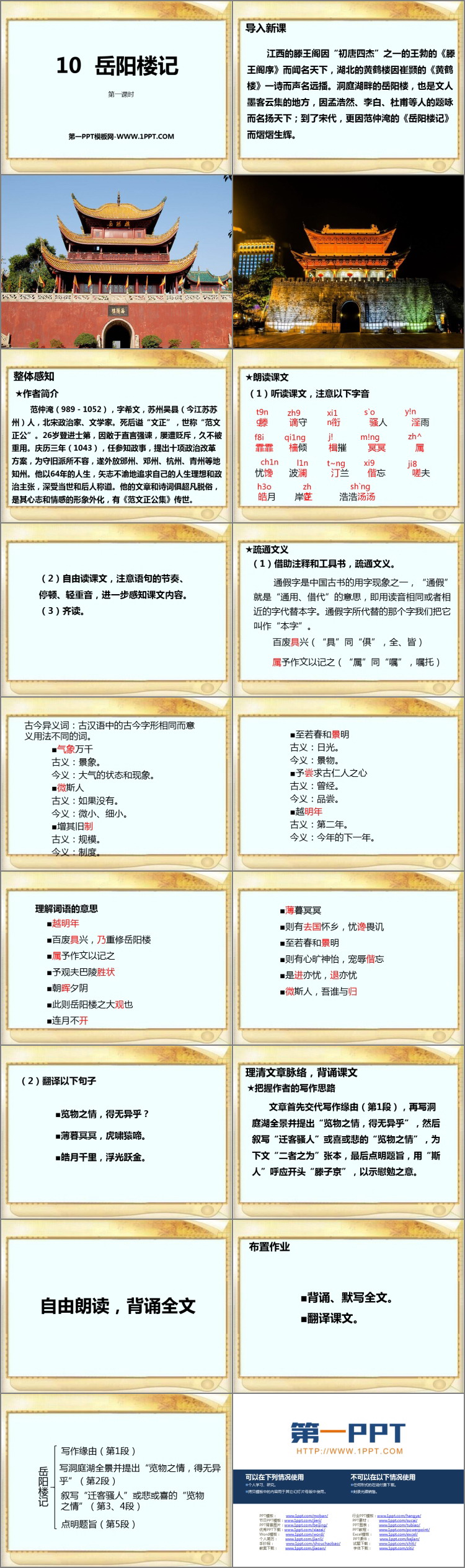 《岳阳楼记》PPT课件包含导入新课、整体感知、疏通文义、布置作业等内容。