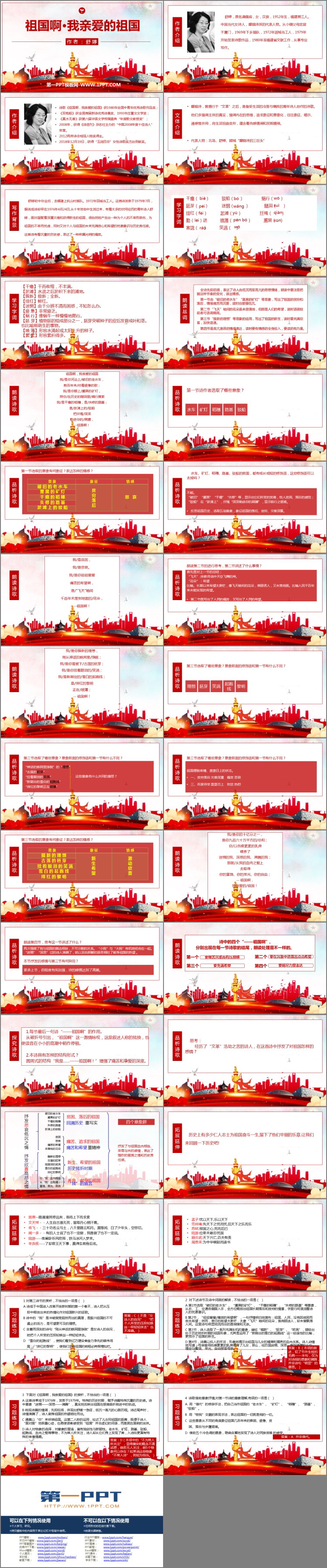《祖国啊,我亲爱的祖国》PPT课件包含作者介绍、写作背景、学习字词、品析诗歌、拓展延伸、习题练习等内容。