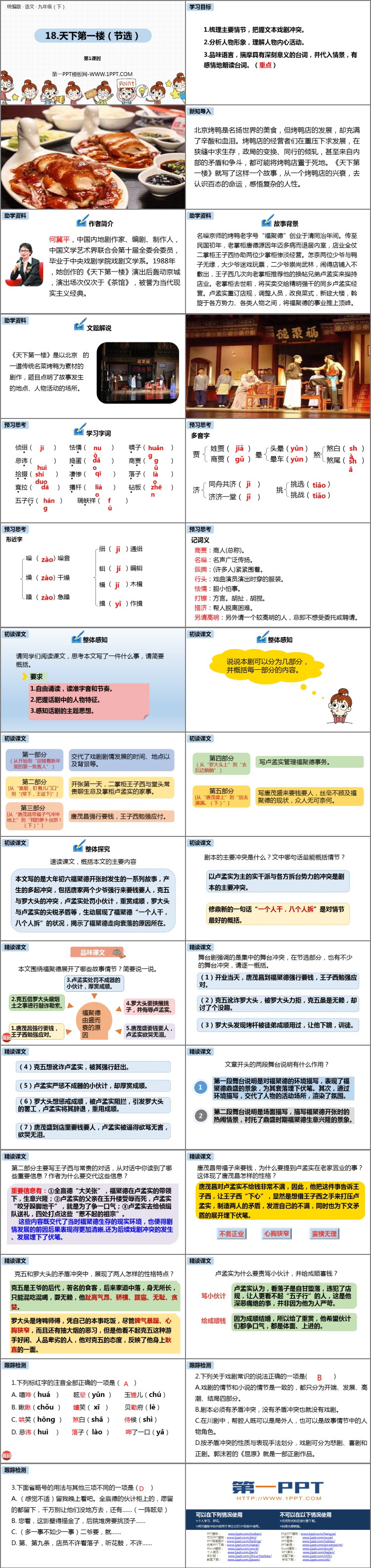 《天下第一楼》PPT课件包含学习目标、新知导入、助学资料、预习思考、初读课文、精读课文、跟踪检测等内容。