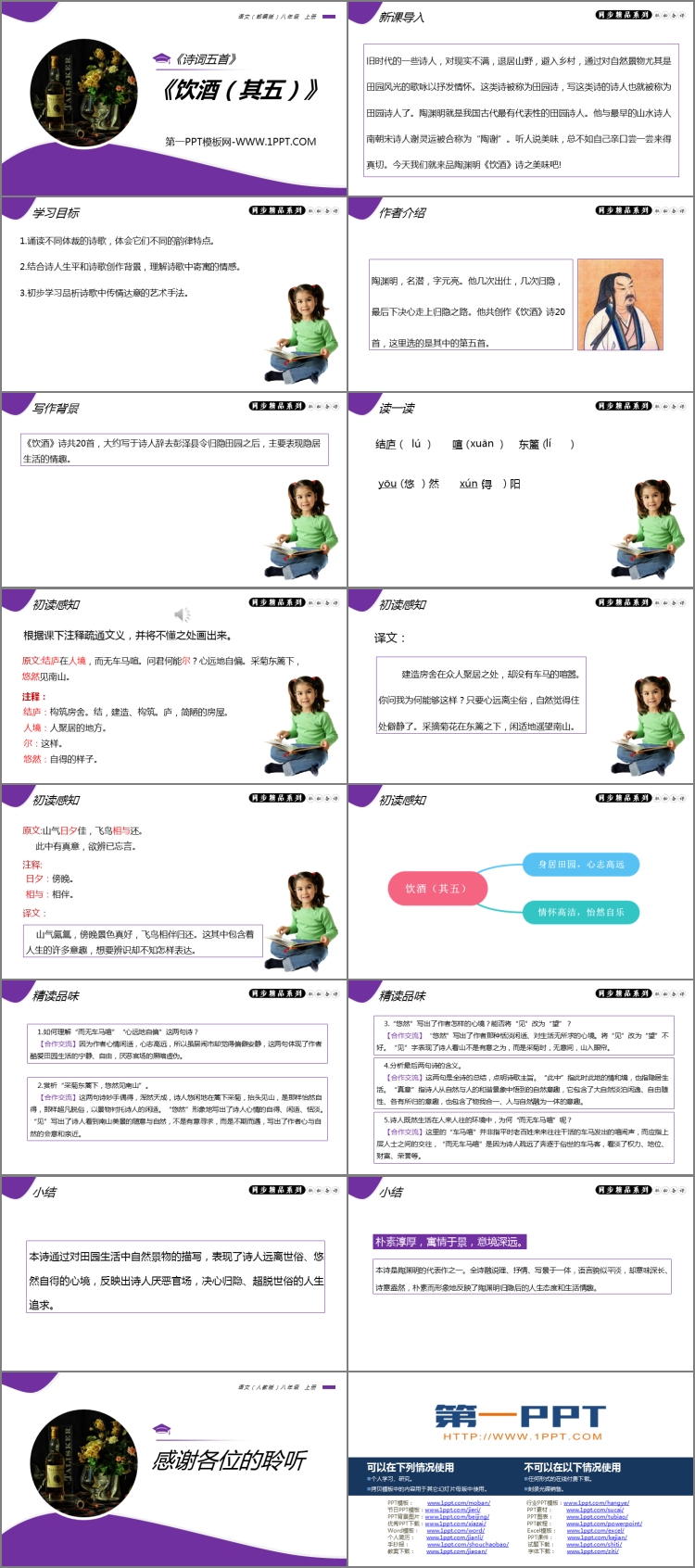 《饮酒》PPT课件包含新课导入、学习目标、作者介绍、写作背景、词语掌握、初读感知、精读品味、小结等内容。