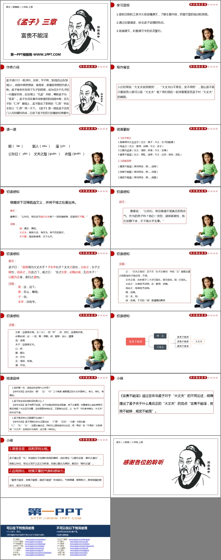 《富贵不能淫》PPT课件包含学习目标、作者介绍、写作背景、词语掌握、初读感知、精读品味、小结等内容。