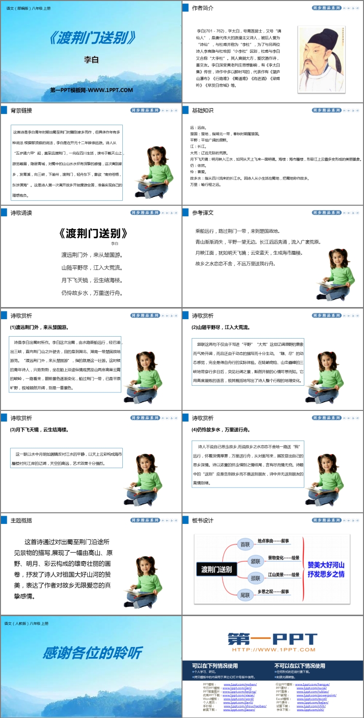 《渡荆门送别》PPT课件包含作者简介、背景链接、基础知识、诗歌赏析、主题概括等内容。