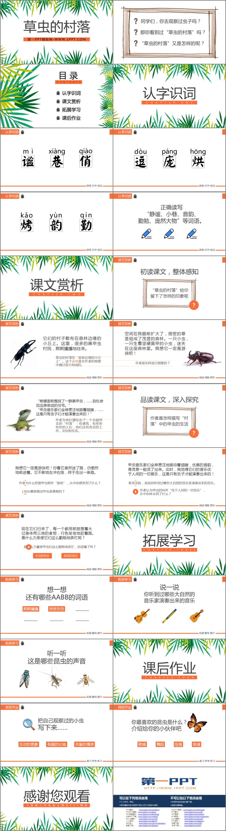 《草虫的村落》PPT课件包含认字识词、课文赏析、拓展学习、课后作业等内容。