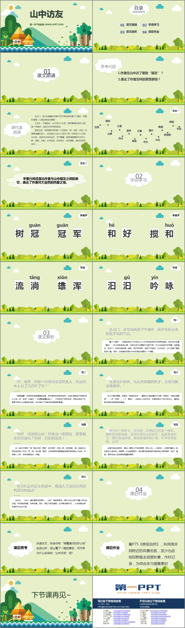 《山中访友》PPT课件包含课文朗诵、字词学习、课文解析、课后作业等内容。