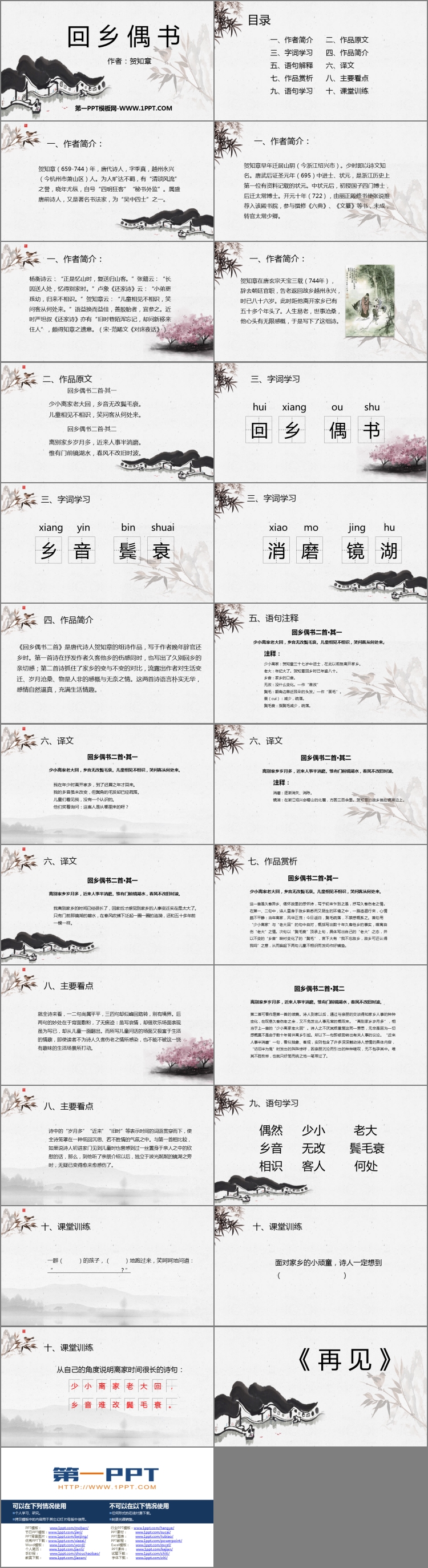 《回乡偶书》PPT课件包含作者简介、作品原文、字词学习、作品简介、语句解释、译文、作品赏析、主要看点、主要看点、课堂训练等内容。