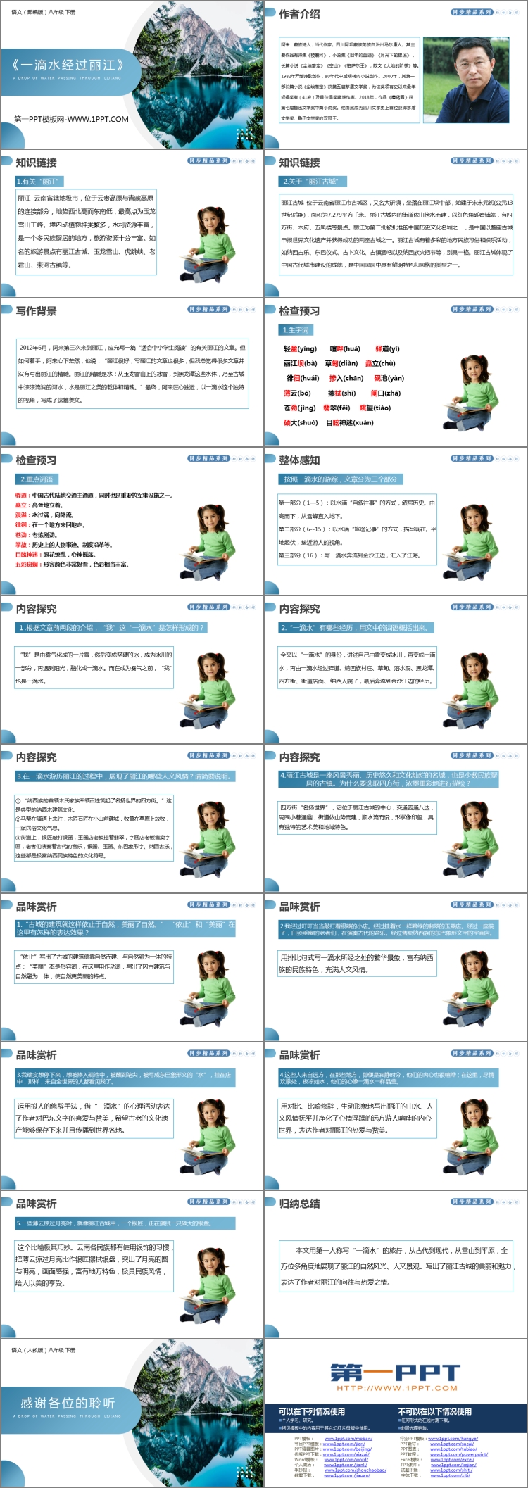 《一滴水经过丽江》PPT课件包含作者介绍、知识链接、写作背景、整体感知、内容探究、品味赏析、归纳总结等内容。