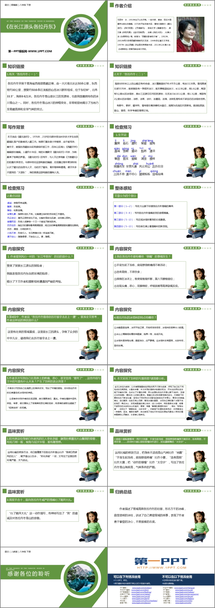《在长江源头各拉丹冬》PPT课件包含作者介绍、知识链接、写作背景、整体感知、内容探究、品味赏析、归纳总结等内容。