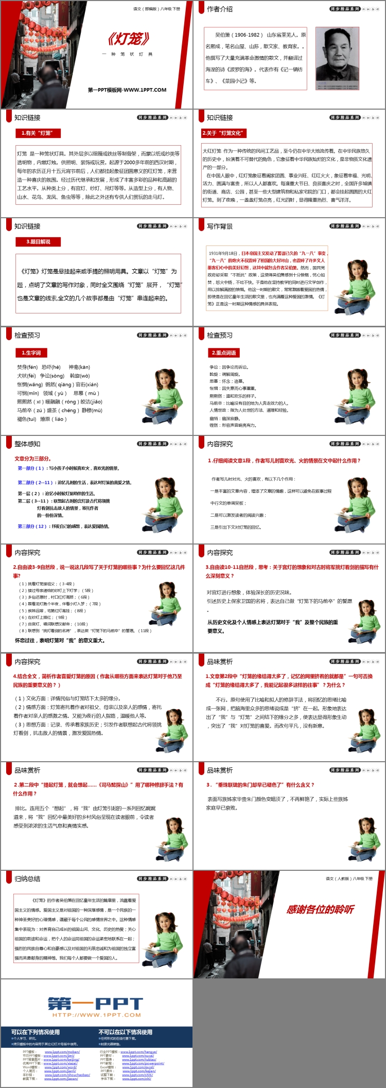 《灯笼》PPT课件包含作者介绍、知识链接、写作背景、检查预习、整体感知、内容探究、品味赏析、归纳总结等内容。