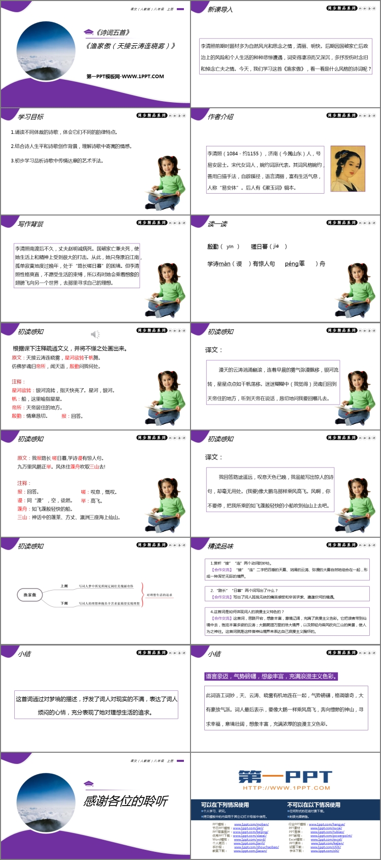 《渔家傲》PPT课件包含新课导入、学习目标、作者介绍、写作背景、词语掌握、初读感知、精读品味、小结等内容。
