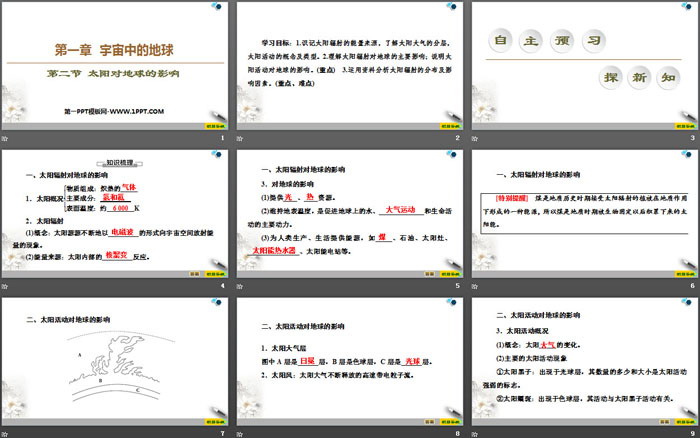 关键词:人教版高中地理必修一PPT课件免费下载,太阳对地球的影响PPT下载,宇宙中的地球PPT下载,.PPT格式;