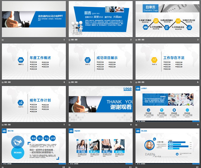 关键词:蓝色扁平化企业简介幻灯片模板,动态公司简介PowerPoint模板,.PPTX格式;