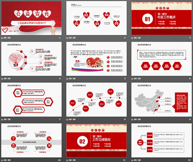 关键词:红色爱心公益慈善宣传幻灯片模板,动态微立体志愿者服务PPT模板,.PPTX格式;