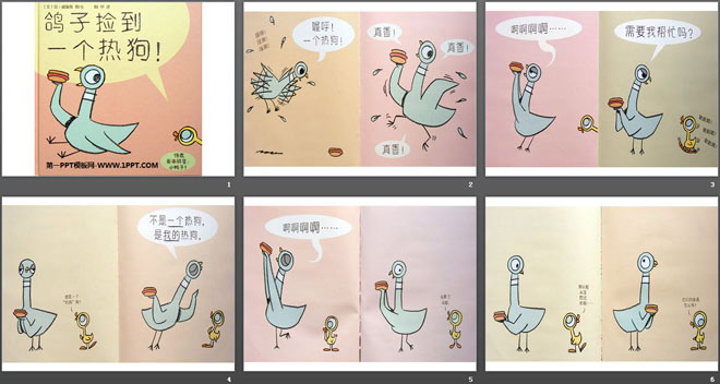 关键词:绘本故事PPT下载,儿童绘本故事幻灯片下载,鸽子捡到一个热狗PPT下载,.PPT格式;
