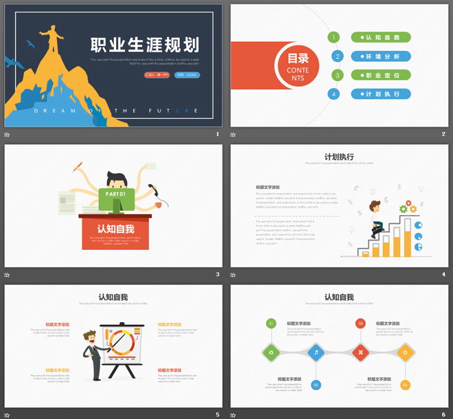 关键词:蓝色幻灯片底图,彩色扁平化PowerPoint图表,动态职业规划书PPT模板,.PPTX格式;