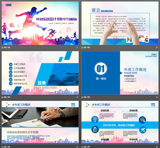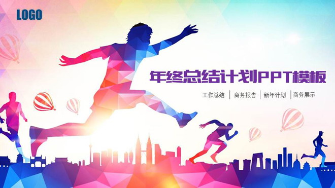关键词:彩色低平面多边形、奔跑人物幻灯片背景图片,蓝色扁平化PowerPoint图表,动态年终工作总结PPT模板,.PPTX格式;