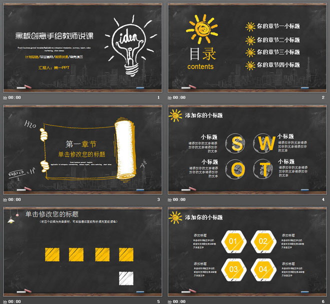 关键词:黑板、粉笔手绘灯泡、粉笔字PowerPoint背景图片,创意教育培训PPT模板,黄色白色搭配手绘风格幻灯片图表,.PPTX格式;