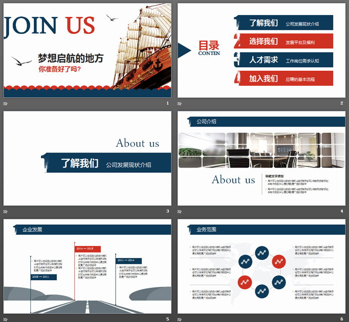 这是一条“扬帆起航”梦想启程主题的,企业招聘公司简介PPT模板,共25页。第一PPT模板网提供精美企业简介幻灯片模板免费下载;
