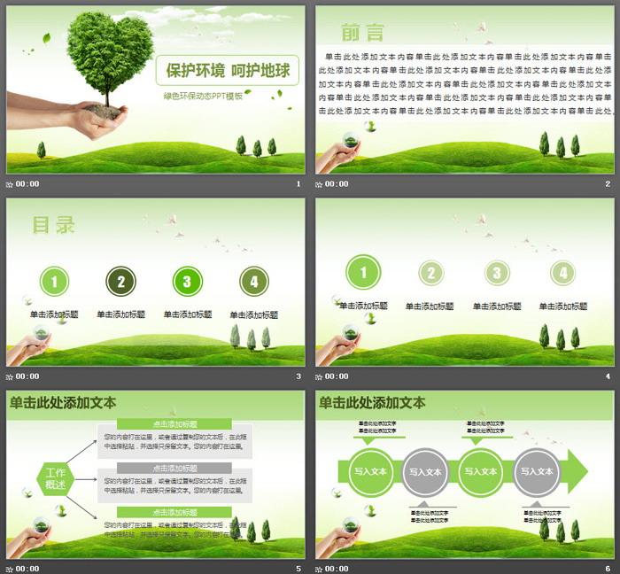 关键词:草地、绿地、绿树、植物PPT背景图片,绿色扁平化幻灯片图表,动态环保PowerPoint模板,.PPTX格式;