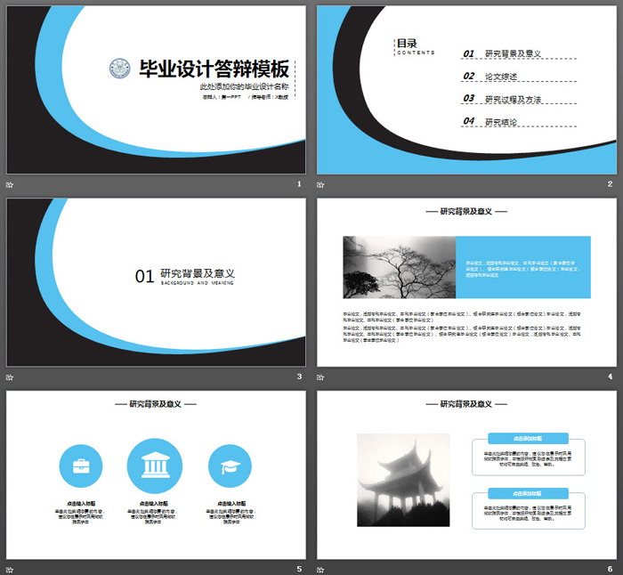 关键词:优美曲线幻灯片背景图片,蓝色黑色搭配扁平化PowerPoint图表,精致硕士研究生毕业论文开题报告PPT模板,