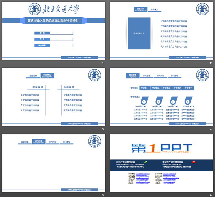 这是一套简洁蓝色带校徽的毕业答辩PPT模板,共6张。第一PPT模板网提供精美毕业论文答辩幻灯片模板免费下载;