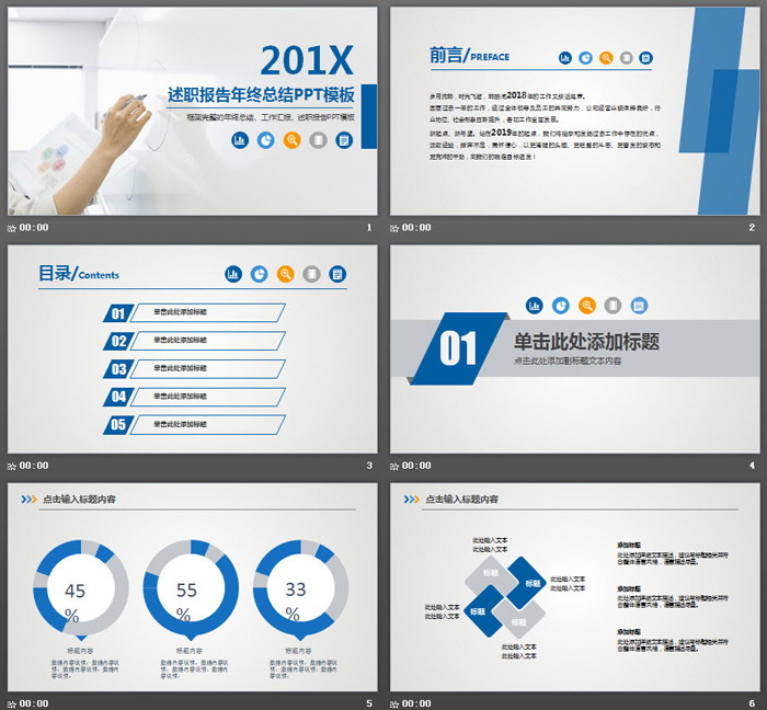 关键词:白板手势幻灯片背景图片,蓝色扁平化PowerPoint图表,动态述职报告PPT模板免费下载,.PPTX格式;