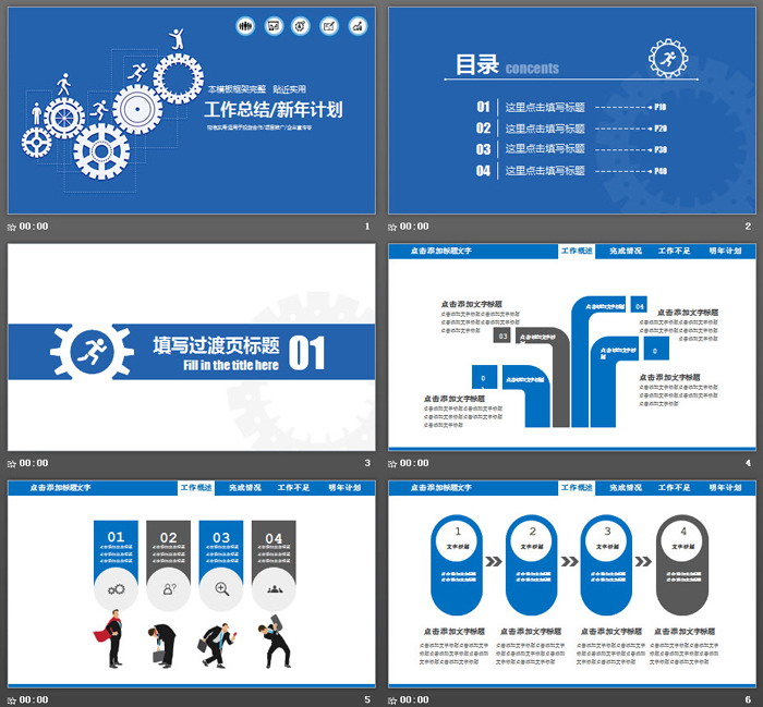 关键词:扁平的小人、齿轮组幻灯片背景图片,蓝色灰色搭配扁平化PowerPoint图表,动态新年工作计划PPT模板,.PPTX格式;