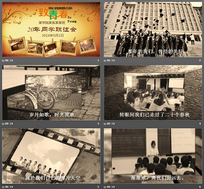 关键词:20周年大学同学聚会PowerPoint模板,黑白老照片幻灯片背景图片,致青春PPT下载,.PPTX格式;