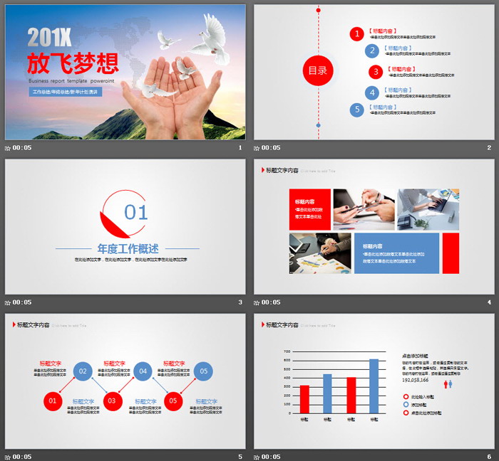 关键词:高山、白鸽、鸽子、双手幻灯片背景图片,放飞梦想主题PowerPoint模板,红蓝搭配扁平化幻灯片图表,动态工作计划PPT模板,.PPTX格式;