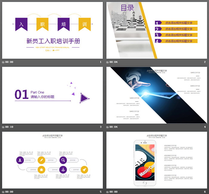 幻灯片模板封面使用了4个黄紫相间的小旗,作为入职培训PPT标题填写位置。